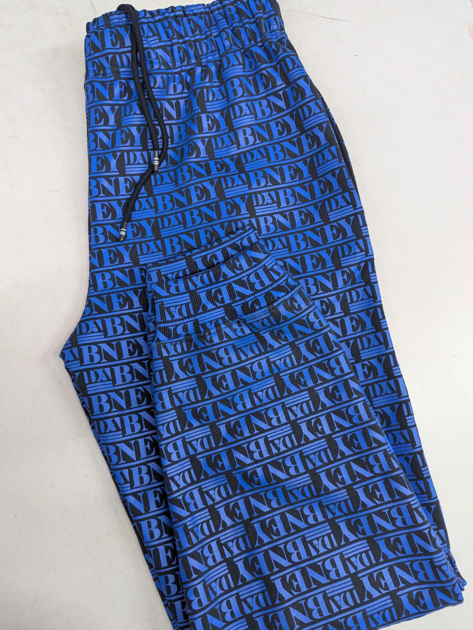 The “DABNEY” track pants continue the bold monogram theme with the black “DABNEY” print repeating across a cobalt blue base, creating a cohesive designer aesthetic. Tailored from the same premium cotton–poly performance blend, the pants deliver a streamlined, athletic fit that narrows toward the ankle without restricting motion. A flat waistband with hidden drawcords ensures a secure, modern silhouette, while angled side seams and discreet pockets maintain a clean profile. The logo pattern aligns seamlessly from hip to hem, echoing the precision of the top. Finishing details include understated yet distinct ribbed ankle cuffs. Combining runway sophistication with streetwear comfort, these pants complete the set as a statement of refined, urban luxury.